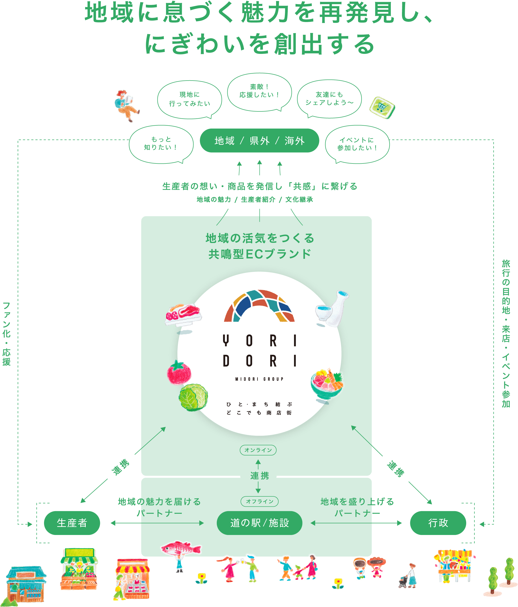 ひと・まち結ぶ:みどりグループのモットーを。 / どこでも:オンラインを指す / 商店街:たくさんの店や商品、人、地域文化が集う